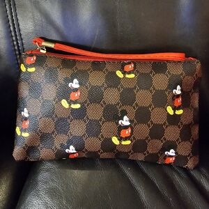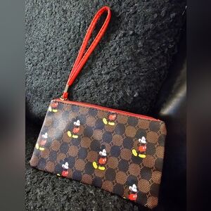 New without Tags Mickey Mouse printed wristlet clutch brown print with red trim. Vegan leather in new condition, no wear or callouts. 8 inches by 5 inches with 6 inch long strap. Ships from smoke-free and pet free home.
