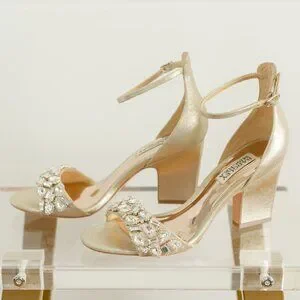 Originally from Neiman Marcus, these Laraine Embellished Satin Sandals by Badgley Mischka are the perfect pair for your next formal event. The color is plantino and reads a warm, metallic light gold with a bit of champagne and platinum. The heel style is great for walking outdoors (no sinking in the grass!) and for comfort.