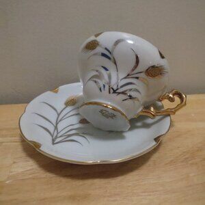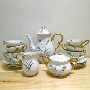This 15-piece coffee/tea set by Oakwood Japan is a stunning addition to any mid-century modern collection. Featuring a natural grass grain pattern on white porcelain, this vintage set includes a tea/coffee pot, creamer, sugar bowl, and six teacups with saucers. Hand-painted raised gilt and platinum decor adds a touch of elegance to the glossy finish. With a pot capacity of 4 cups or 32oz, this original and set is perfect for entertaining guests or enjoying a cozy afternoon tea. Very good pre-owned condition. Cup handles have some minor gilt wear. Please see photo.