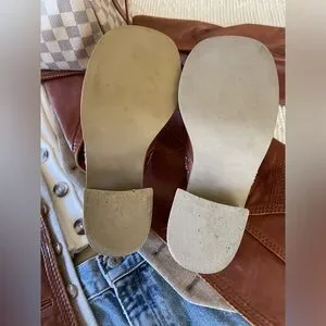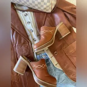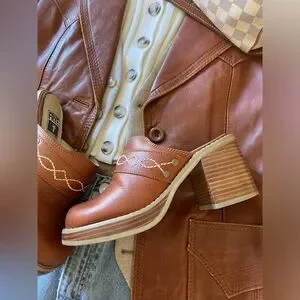 This pair of rare vintage Frye Platform Clogs are in great condition. They have an ivory/white detailing stitched into chestnut brown leather.