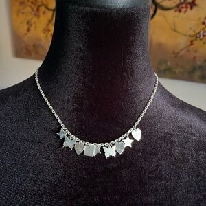 Details: GUCCI Sterling Silver Trademark Charm Necklace. The necklace is crafted of sterling silver and features butterfly, star, and heart charms adorned with the Gucci logo. This is a whimsical necklace with the iconic style of Gucci.