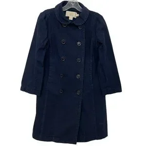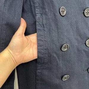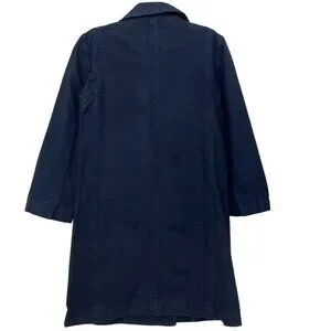 They describe it as Weathered and broken in and super comfortable. It is a dark navy color, this coat will dress up any casual outfit. 100% cotton. No stains, holes or defects. Smoke and pet free home. Length 34" Pit to pit 17"