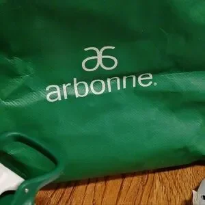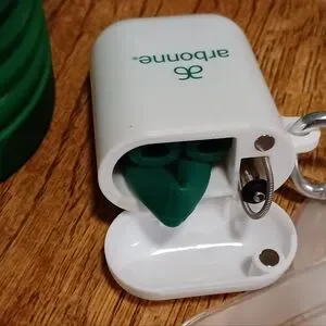 This Arbonne grab and go kit has a collapsible drinking container, a reusable straw with case, measuring spoons, and reusable ziploc bags.