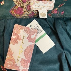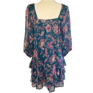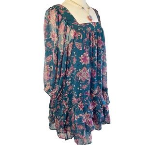 Dark pine green with paisley floral print in magenta and beige over a semi-sheer organza. The entire dress is fully lined except for the 3/4 bubble sleeves, which are semi-sheer. This go-anywhere-do-anything dress features a square neck and a tiered, ruffle skirt. True to size and relaxed fit. 100% Polyester; Hand wash.