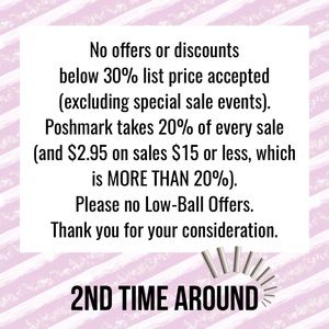 RESOLD NWT listings MAY have minor stains, loose threads or pulls, loose or missing buttons, minor fabric pilling, holes etc. We are NOT RESPONSIBLE for anyoneβs allergies or sensitivity to smells. SMELL IS SUBJECTIVE AND THEREFOR CANNOT BE NOTED.