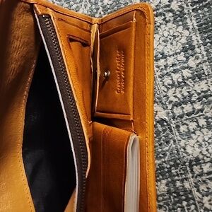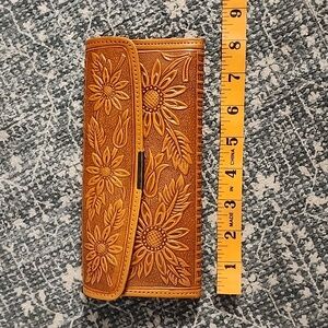 Made is Mexico Cute Little Floral Wallet. has a button closure , opens up to 2 zippered slots, and is a business card/picture keeper. Idk slot with no cover. 2 pouches a snap and zippered. leather is in excellent condition. not a "branded high-end wallet" but still very cute. 72402