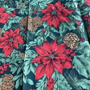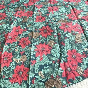 Vintage Christmas Holiday Tablecloth - this is a festive retro 1980's design printed on polyester/cotton blend coth. Brilliant colors and a pattern that includes red poinsettias & berries, greenery and golden brown pine cones. New with sticker attached / Never used / No damage or flaws.