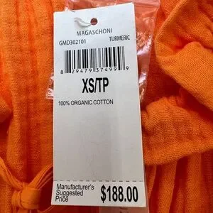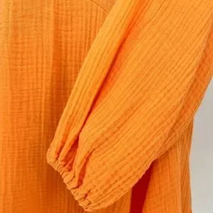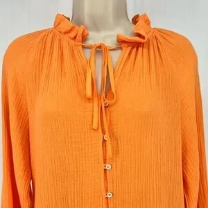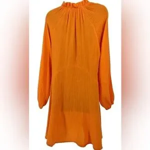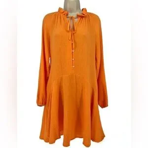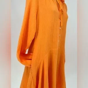 This v-neck cocktail length dress with pockets by Magaschoni is crafted with a lightweight cotton gauze fabric in a stunning bright orange color. Features include long sleeves with elasticized cuffs, a button-front, a ruffled collar and a flattering circle skirt.