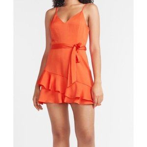 Ruffle Wrap Front Skort Romper by Express in Coral, a vibrant orange-pink color. Size S.