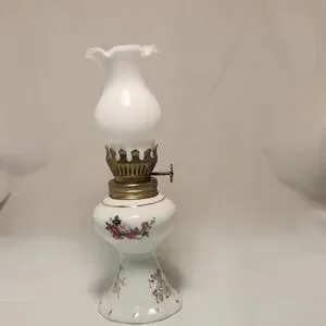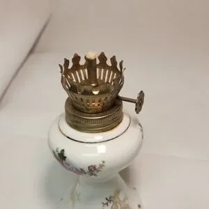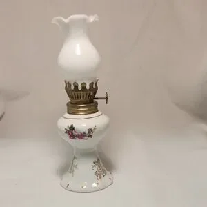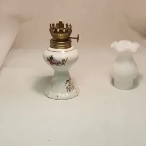 vintage mini oil lamp, white with roses, marked Hong Kong has wick