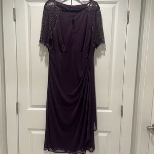 Laura Plus dress, special occasion. Beautiful beaded and sequinned sleeves. Keyhole opening below neckline. Lovely ruching detail on the side and the back of the dress which provides a very flattering look. It is a plummy, purple colour. This dress has been worn once, as mother of the groom. Originally long length, I had it professionally tailored to be shortened as the hemline was damaged through my shoes catching on it. Has also been dry cleaned