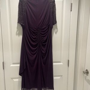 Laura Plus dress, special occasion. Beautiful beaded and sequinned sleeves. Keyhole opening below neckline. Lovely ruching detail on the side and the back of the dress which provides a very flattering look. It is a plummy, purple colour.