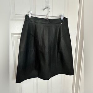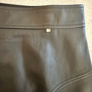 Faux leather A-line skirt. Slip on with back zipper. Luxurious looking, very polished. The zipper still has the original packaging (green tape).