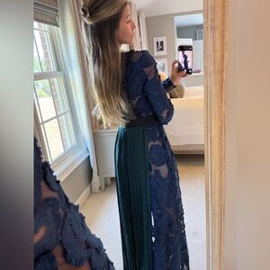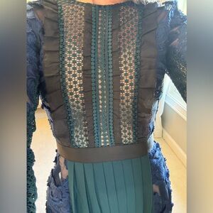 Navy and Emerald Green stunner of a gown. So many gorgeous details - several types of lace and pleats. Comes with nude slip. Has pockets! Self portrait size 0. Hemmed for 5’2” with 4” heels. Worn once.