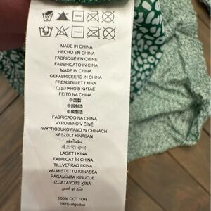 Green and white 3/4 sleeve blouse. End of sleeves have a fabric tie.