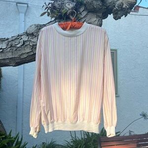 Striped Delight. This is an adorable vintage 80s Liz Claiborne long-sleeve crewneck pullover woven with adorable textured pastel pink, yellow, peach, and white vertical stripes. In superior condition with no visible flaws, the ‘sweatshirt’ top features ribbed cotton detailing at the neckline, cuffs, and waist. Size small but could also fit medium. An ode to sweet nostalgia with a contemporary flair. This top reminds me of carefree days with the crisp wind gently blowing at sea, carefree days at the beach. It also has a touch of retro Saved by the Bell fashion.