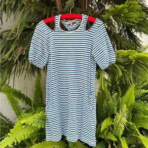 Super cute See by Chloé blue and white striped mini dress with peep shoulders, two side pockets, subtle cap sleeves, and a twisted racerback. Crafted from 100% cotton. This is an easy, effortless spring-to-summer dress with a twist :) In great condition.