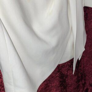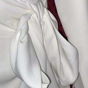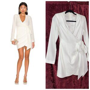 Long-sleeved mini dress with crossover silhouette and bow detail.