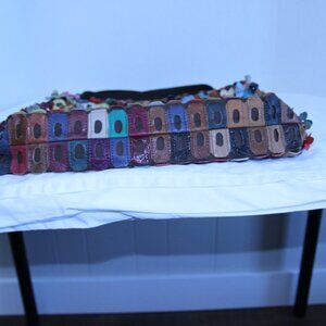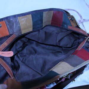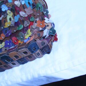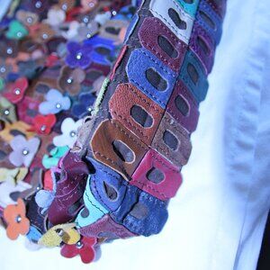 A large leather bag covered with dozens of flowers in a slouchy boho style