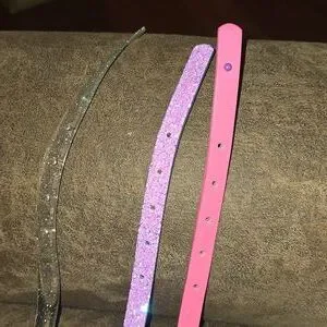 Girls belt set. I'm not sure these were ever worn. One purple glitter, one pink studded, one clear with rainbow glitter.