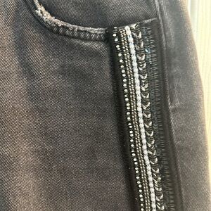 Three people gray denim frayed skirt, mini with embellishment down either side of the pockets