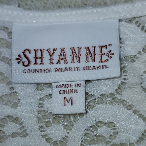 Shyanne Country Western Wear White Lace Top size M. Pre owned condition with no stains or tears. 85% nylon, 15 % cotton.