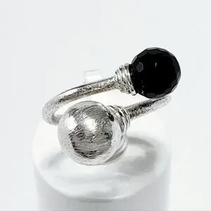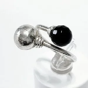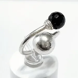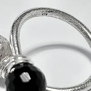 Sterling silver with black onyx faceted stone, size 7.0 mm. Ring marked 925 Satin finish.