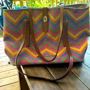 Bought on Posh, used twice and realized it was too big for what I needed. Small blemish on the outside as well as some dark spots-all came with the bag from the original purchase. Blemishes in pictures. Non-smoking house. Official name is “Dooney and Bourke Claremont Chevron Dover tote -multicolor “