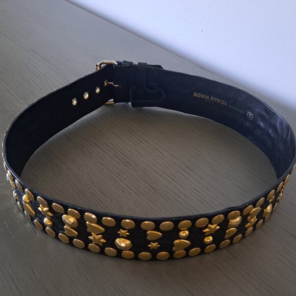 Incredibly rare Sonia Rykiel Paris wide leather belt with studs, VTG 90s. Made from supple black leather, with gold metal heart, star and faceted/smooth circle studs throughout. Versatile and chic. Made in France. Marked size 2 (FR) / 31.5in