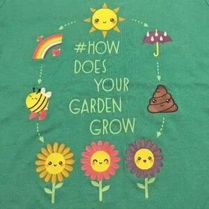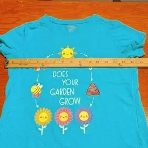 Perfect for your little garden helper! This shirt features an adorable graphic print of the circle of events needed for your garden to proser! A smiling sun, an umbrella with rain, a rainbow with hearts & stars, a happy little bee with boots, and even a poop emoji, with smiling flowers at the bottom. Super cute! This tee is lovingly used, but still lots of life left-- only some mild pilling from use. Please note, it's a cheerful mint green color--I'm not sure why my phone camera made it look blue--it's definitely more on the green side. See pics for up close details & measurements. Smoke free, pet friendly home. Bundle with more items to save even more! Your little nature lover will love it!