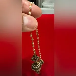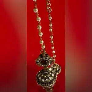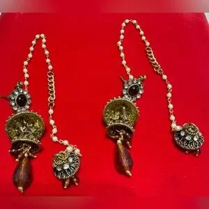 This is a beautiful piece. It is a brown Jumka, which has white stones on it and extension that goes over the ear and hangs in the back of the ear. This part has pearls in it. And a smaller Jumka at the end. Very comfortable to wear and goes with a lot of outfits One of my favorite pieces in my collection.