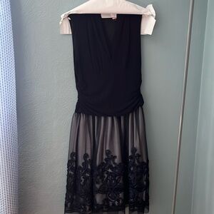 Navy blue cocktail dress, size 14. Beautiful detailed work on the skirt. Flattering for midsection of the body. Worn once for an event.