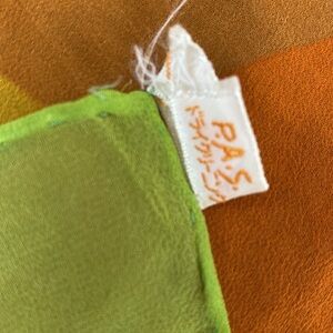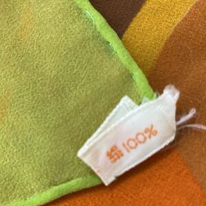 Very Cool Geometric Print on this Vintage Scarf by P.A.S.. Classic Mid Century Colors of Orange, Brown, Yellow and Green. tiny marks noted in photo. Would make a great Handbag scarf. 28.5”x30”