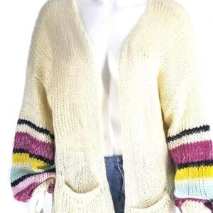 Open Front Cardigan in Cream, Vibrant Toned Stripe Accents, Slouch Sleeves, Two Front Pockets. Warm And Comfy For Winter, Great for Layering.