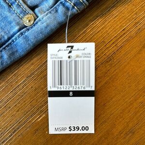 New with tag- Girl’s 7 For All Mankind A Pocket Shorts Sz 8. Purchased from Nordstrom Rack. Color- Desert Springs. Some loose stitching on the back of 1 pocket (see pic). Can be unrolled for a longer length. Waist measures about 11 inches laying flat. Made of Cotton, Polyester, Viscose & Spandex.