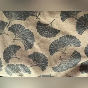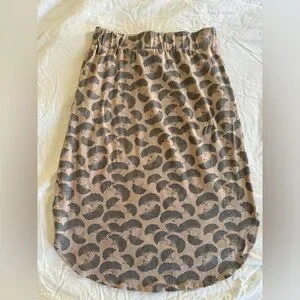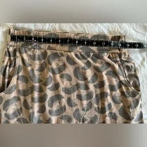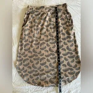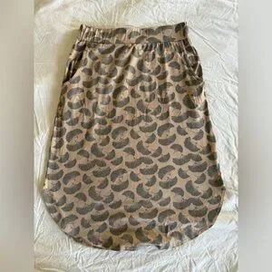 Excellent used condition. Cute stretchy skirt with elastic waist and pockets. Color is a light tan/dark beige with blue-grey print.