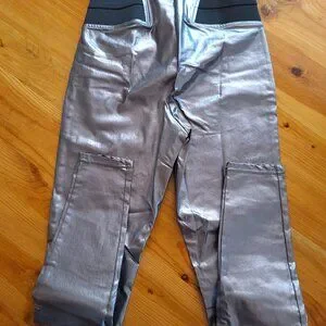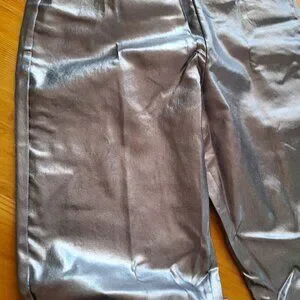 Another item bought for mom a few years ago, she recently tried them on and they are too big. There is a hidden pocket in the (elastic) waist line, and a small 1cm black line where it was either scratched or a dent in the coating. These are a shiny material and would be perfect for semi-casual social gatherings as well as lounging at home. I will have another listing with a large size soon. Pet friendly home but kept in spare room closet. Wood background is dining table, not the floor.