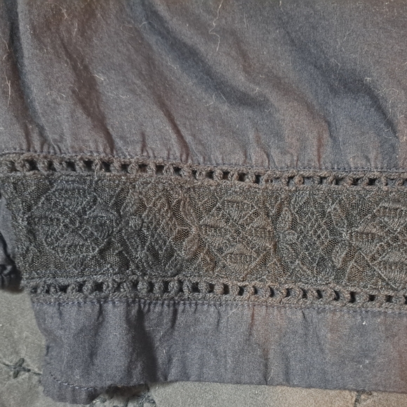 Pretty boho top featuring a v-neck, elastic cuffed sleeves, and embroidered lace trim. In good preloved condition.