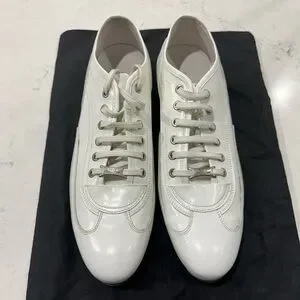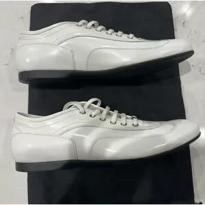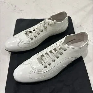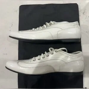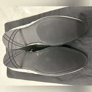 White Leather with rubber bottom. They are 42 euro 9 us, but fit me good and I’m a 10. They definitely run big. New dust bag.