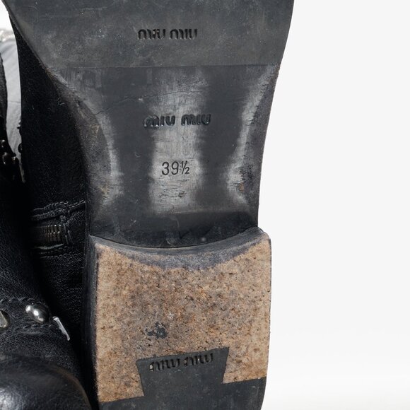 Condition: Excellent; the leather and studding is in wonderful condition. While the boots have evidently been worn outside, the wear to the heels are even, and the factory Miu Miu topy on both boots are in good condition. Outdoor wear is visible on the exposed leather section of the heels, there is light scratching on heel cups and on toe boxes.