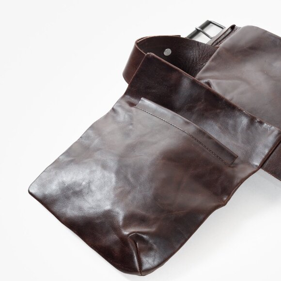 Annette Görtz focuses on high-quality materials, clear lines and modern cutting techniques. This dark brown leather belt with two "patch pocket" pouches, on an adjustable strap with a buckle closure and two eyelets for adjustability, may be worn at the hip for utility as well as for style.