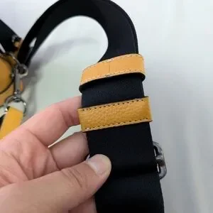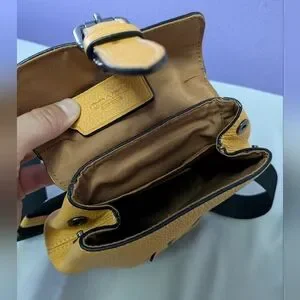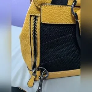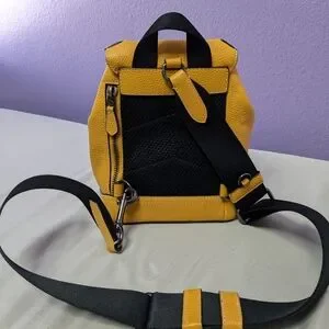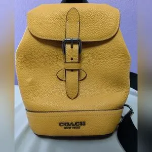 Small Coach brand bag/backpack in goldenrod yellow, pebbled leather material. Sturdy black strap. Excellent used condition due to barely being used, then stored - could be almost NWT. Clean inside and coming from a smoke-free home. Please see photos! Can be used by men or women.
