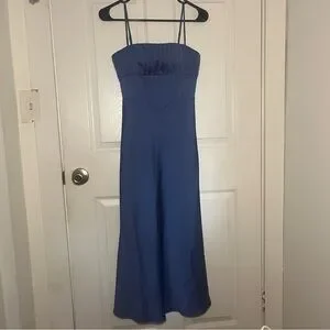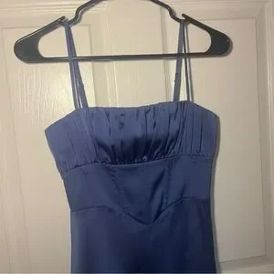 Blue satin spaghetti strap midi dress by Misha in the style Amalthea. Has a ruched bust, corset effect on the torso, and flares at the bottom. Size XXS and true to size! In very lightly used, great condition