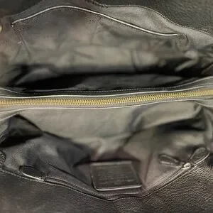 This large Coach satchel bag is a must have for the professional and is perfect for carrying your essentials to the office and for an evening out. It is a beautiful dark cream or tan pebble leather with bronze colored hardware, rivets, and turn and twist flap closure. There is room for all your needs with three large compartments (one zippered) a small zippered pocket and open pockets for a cell phone, pens, etc. You will love everything about this beautiful fashion statement! 13 1/2” L, 10”H, 6 1/2” W