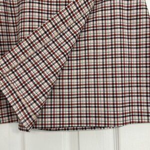 Lovely plaid wrap mini skirt (14.5") by gianni bini. Size 2. Tailored and well-matched small plaid in browns, black, and cream colors. Front of skirt has a full wrap. Hidden zipper on back is smooth, and one hook & eye closure at top. Fabric is 64% polyester, 31% viscose, and 5% elastane. Suggest dry clean.