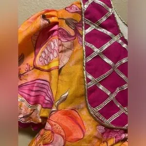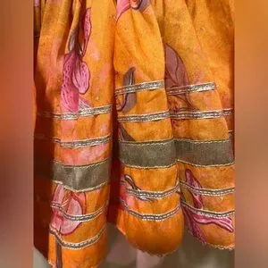 Be your chicest self with this stunning top and pant set. The peplum top is adorned with a beautiful orange floral print and intricate lace detailing, and it pairs perfectly with the matching pants. Style it with statement accessories for a complete look.