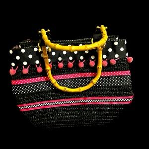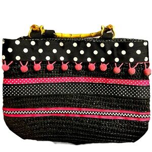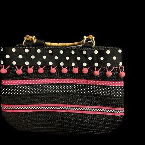 This is an adorable pink & black woven bag from St. John’s Bay. Size is roughly 8 x 10. One large inner zipped pocket and one smaller one. Wood handles. In excellent used condition- No missing Pom’s. Inside is clean. From a smoke-free home.