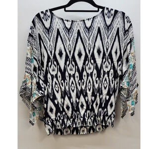 Cato Peasant Top Blue Teal Tan Boho Kimono Sleeve