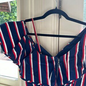 Size 2 and in great condition. One sleeve is just strap and off the shoulder. Asymmetrical bottom. Navy blue, red, and white.