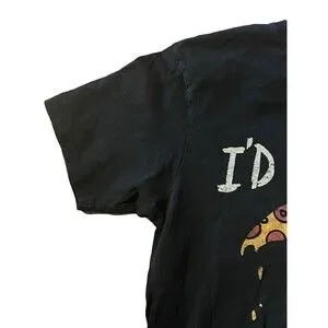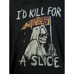 This black cotton t-shirt features a graphic print of the Grim Reaper holding a pizza slice, with the words "I'd Kill For A Slice" written in bold letters. The short sleeve shirt is perfect for summer, spring, or fall, and comes in a regular fit with a unisex design. It is made by Black Matter by Goody Two Sleeves, a brand known for their unique and humorous clothing.